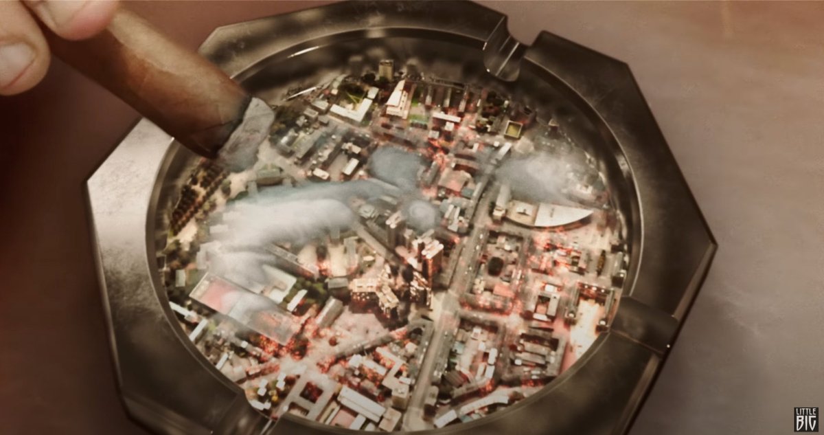 дальше взрывается дом, который оказывается всего лишь пепельницей для злого дяди, который курит сигары и пьёт виски (тоже стереотипная американщина). ого получается злому дяде-американцу пофиг на человеческие жизни??? он сбрасывает на города свой пепел???