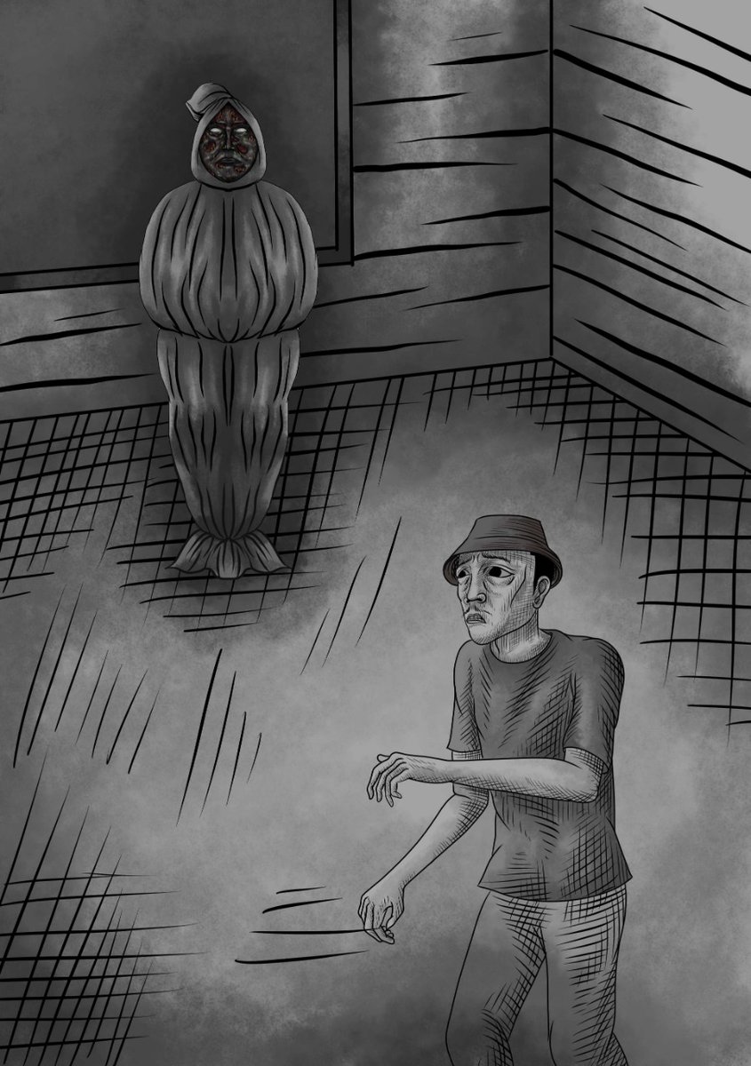 baru empat langkah dia berbalik arah, kaki-kaki Pak Sarno terhenti mematung ketika ekor matanya menangkap satu sosok berbobot badan besar berbalut kain putih berdiri dua langkah di belakangnya, tubuhnya seketika gemetar ketakutan,