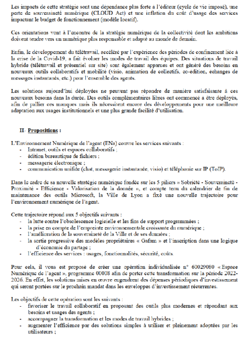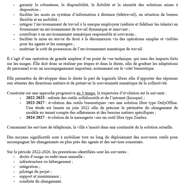 Face au coût des licences Microsoft et la réduction de la durée du support par l'éditeur, la ville se lance de plus en plus vers le logiciel libre et se tourne vers @only_office pour arriver à une cible "80 % de bureautique libre et 20 % restant de