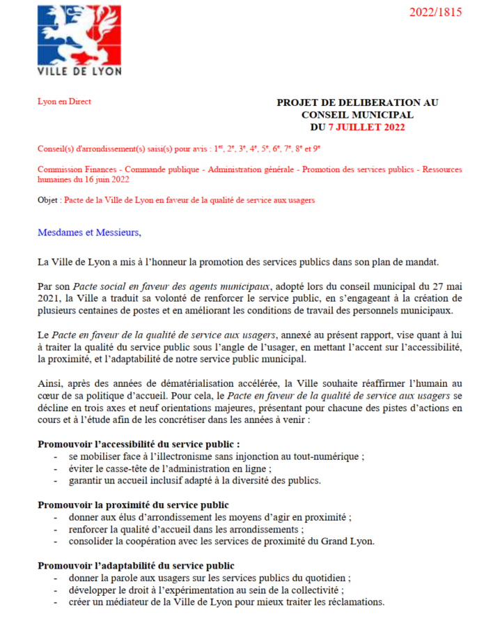 La Ville va aussi engager un "Pacte de la Ville de Lyon en faveur de la qualité de service aux usagers".