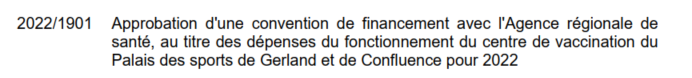 Dans cette délibération, on apprend que le coût pour la Ville de l'installation du vaccinodrôme au Palais des Sports de Gerland et à Confluence s'élève à 293 000 €.