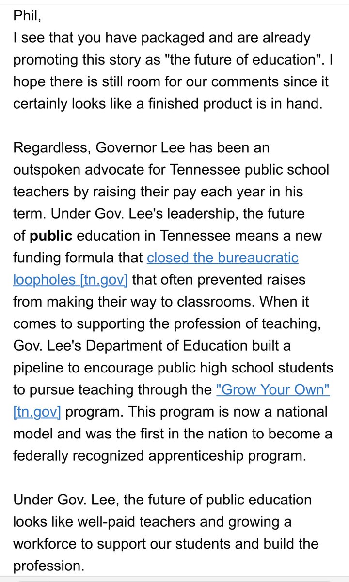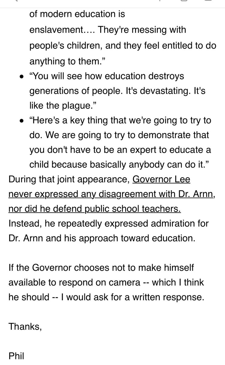 .@GovBillLee’s office was told exactly what would be in the story and given an opportunity to respond specifically to Arnn’s comments - and to explain Lee’s failure to defend teachers. 6/