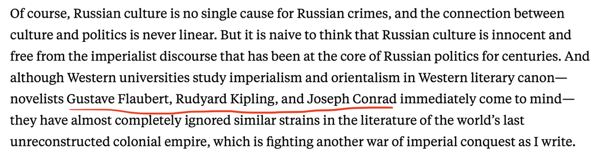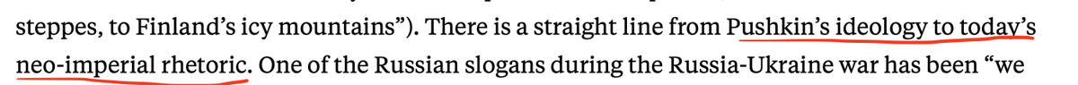 I think the author understands this, and I think he's making a pitch for the critical study of more Russian literature in the West (which is good). More broadly, directly linking "Pushkin's ideology (whatever it is) to Putin's deranged rhetoric is far fetched. "A straight line"?!