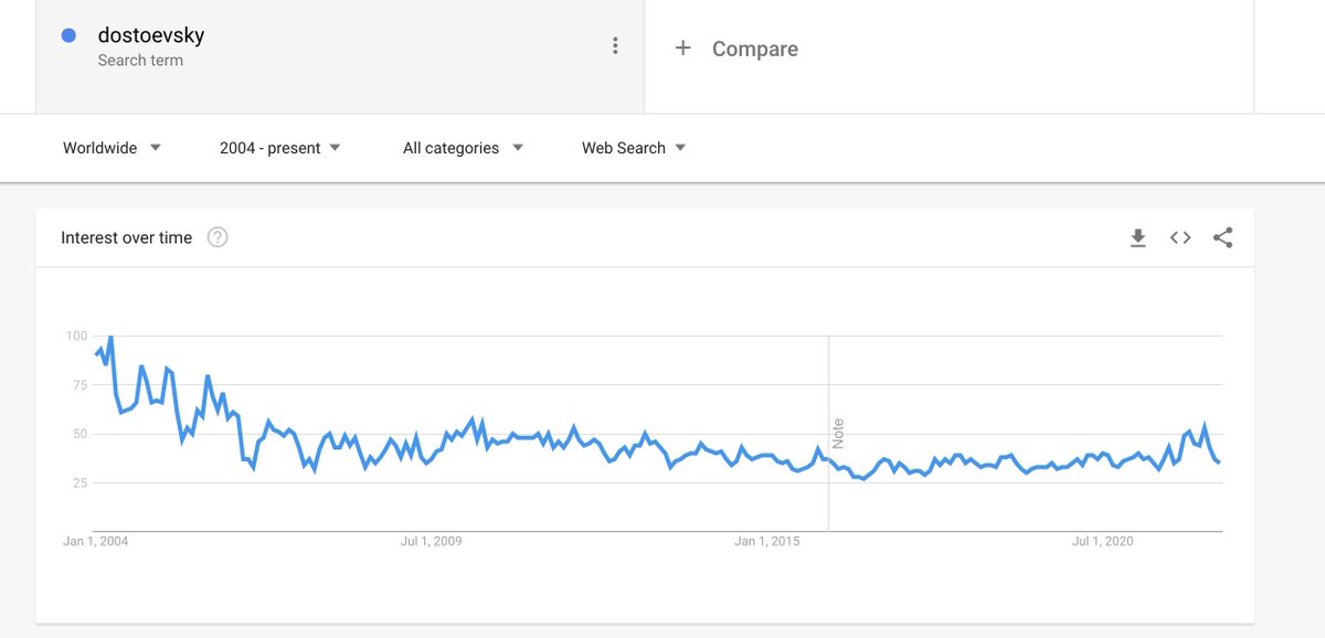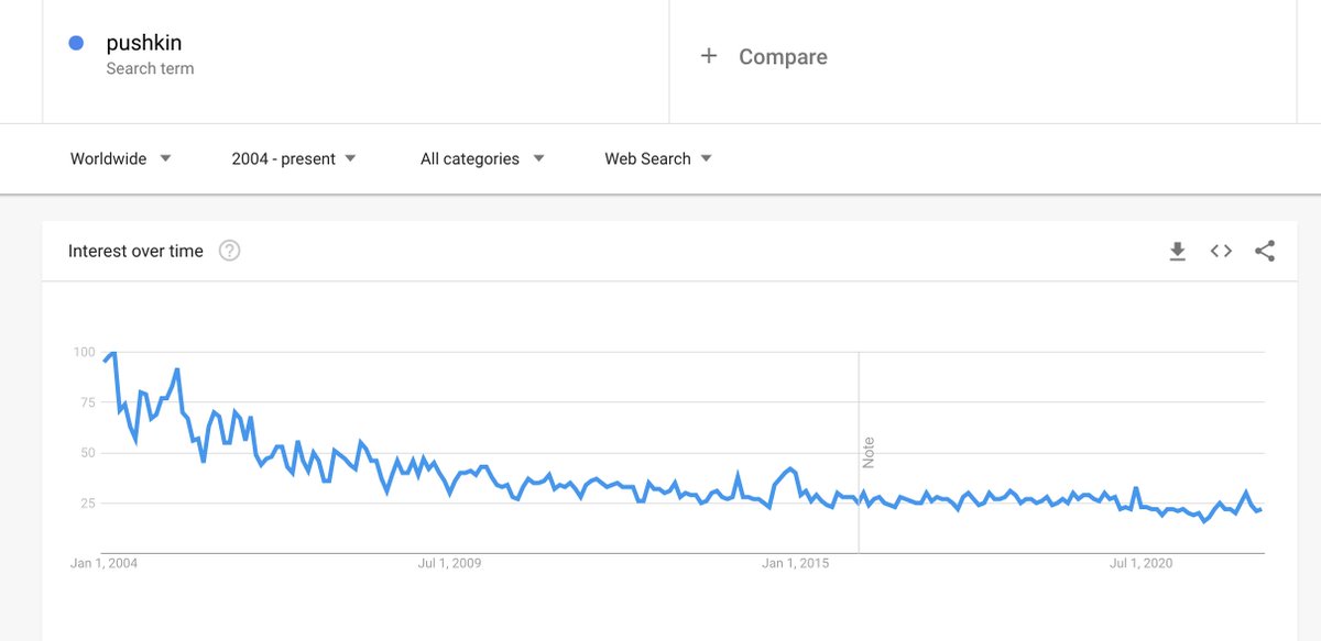 It's btw one of many articles I have read in recent months about what monstrosities 19th c. Russian writers actually were. Still, there's been a declining interest in Dostoevsky and Pushkin since 2004. Maybe that will change now that we've discovered that they were imperialists?