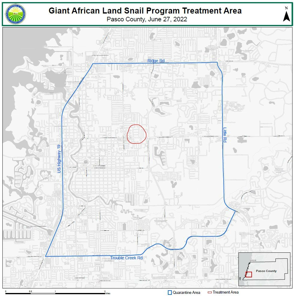 On June 23, 2022, the Florida Department of Agriculture and Consumer Services (FDACS) confirmed the detection of the giant African land snail in the New Port Richey area of Pasco County.