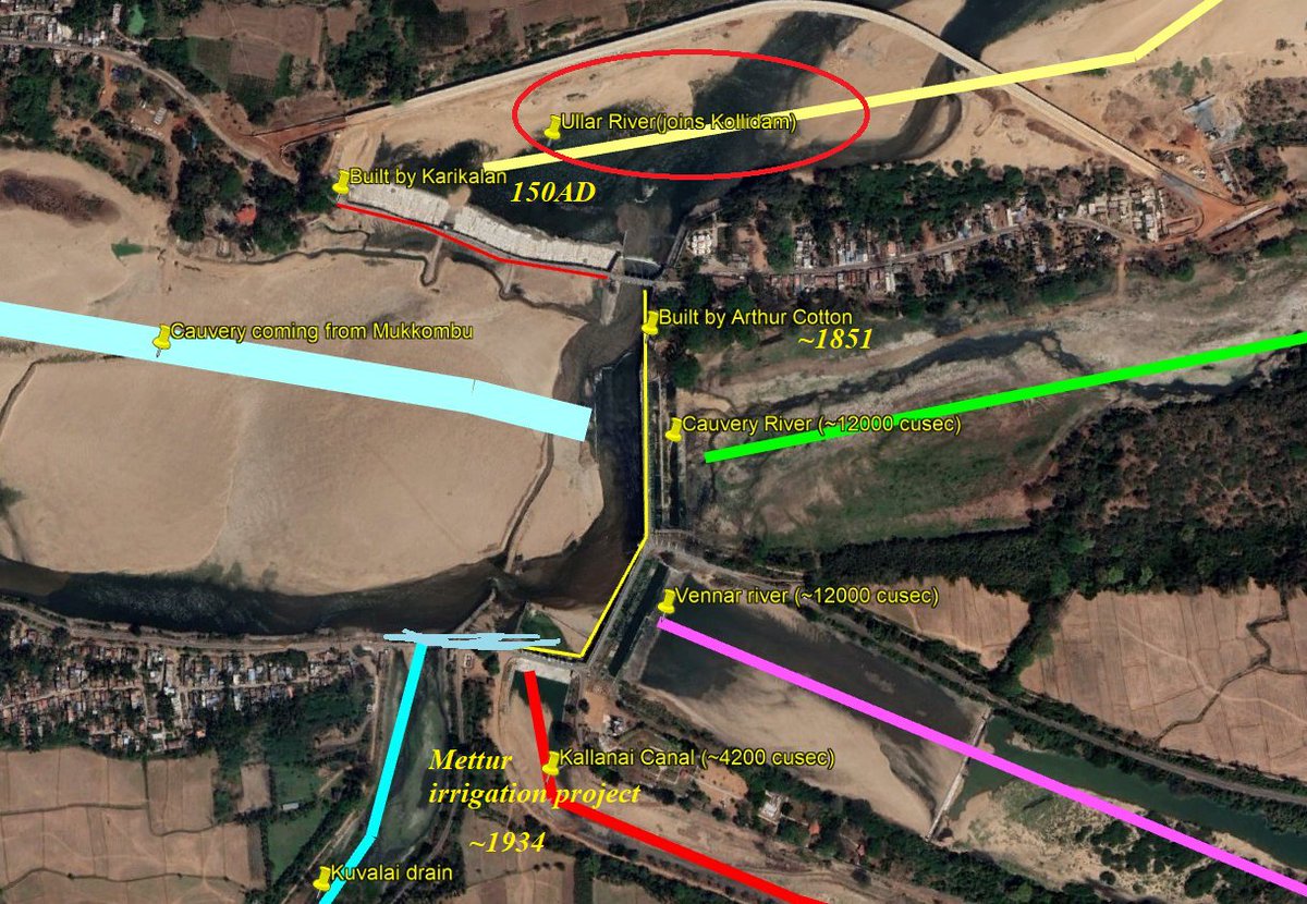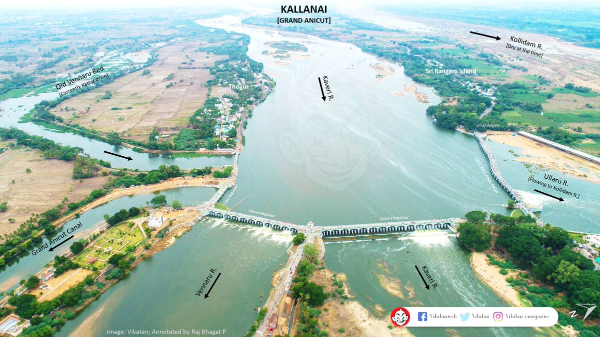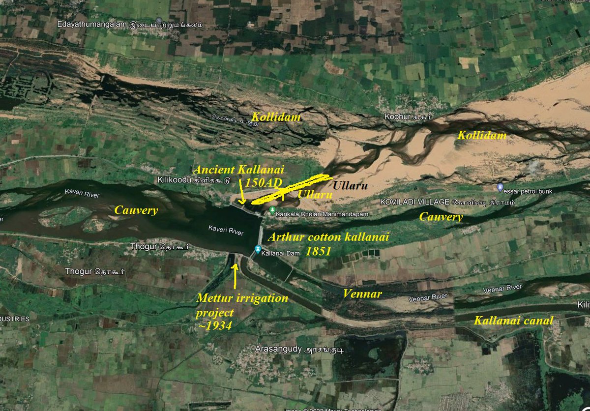 Ullaru is the smallest named river in #TamilNadu with the length of ~1.4km, connects Cauvery with Kollidam. Karikala Chozan built his Ancient Kallanai barrage in Ullaru river to stop water draining into Kollidam. Aruthur Cotton & Govt of Madras expanded the Kallanai barrage 1/2