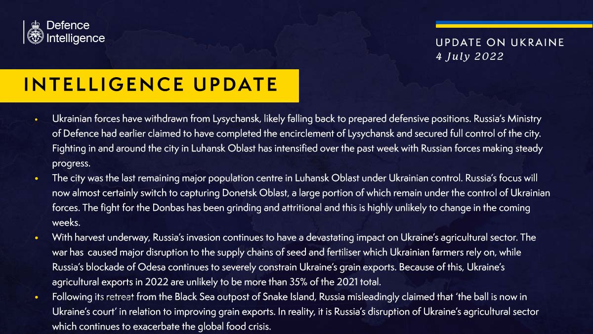 Ukrainian forces have withdrawn from Lysychansk, likely falling back to prepared defensive positions. Russiaβs Ministry of Defence had earlier claimed to have completed the encirclement of Lysychansk and secured full control of the city.