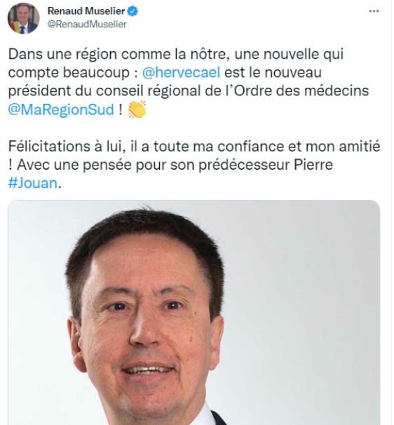 13/ Un médecin qui vante un traitement non-éprouvé, retweete à gogo un site de désinformation, est grillé bien sûr. Que nenni: le Dr Hervé CAEL élu récemment Président du Conseil Régional de l'Ordre des Médecins de PACA. Sous vos applaudissements. Et ceux de Muselier, of course🔽