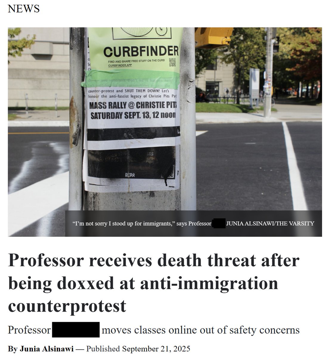 Worse? HOW ABOUT DEATH THREATS? @UofT student paper @TheVarsity recently ran & then quietly killed a story about harassment & death threats against a faculty member after Caryma Sa'd doxxed them. It was allegedly killed after legal threat from the Queen of Lawfare. #ProtestMania