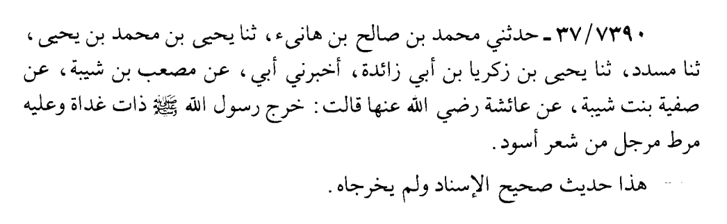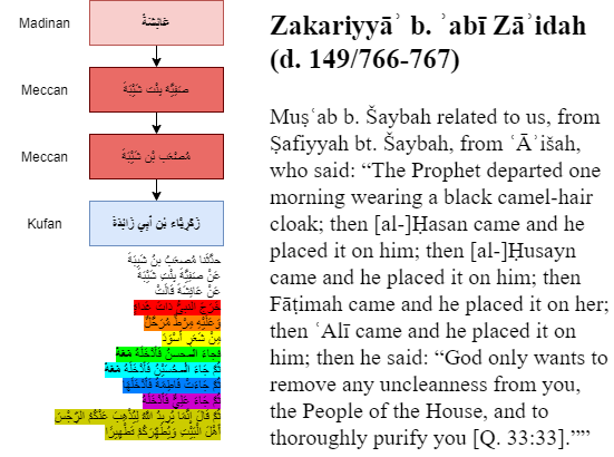 In sum, this tradition about the Prophet's mantle and family can be traced back to the early 8th-Century Kufan CL Zakariyyāʾ; it was often regarded as ṣaḥīḥ in Sunnī scholarship; but there are mixed judgements on Zakariyyāʾ and his source; & the hadith matches a Kufan context.