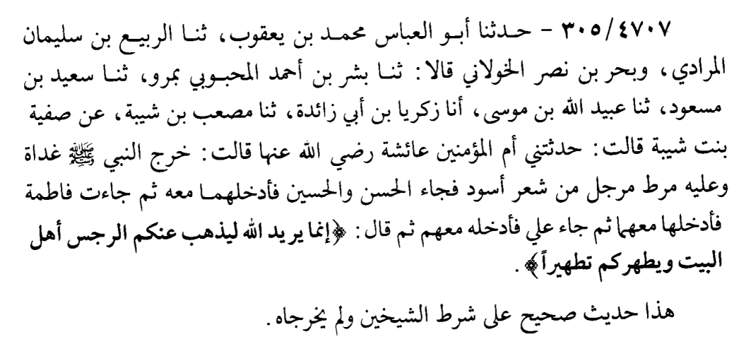 The hadith in question can be found in various Sunnī Hadith collections, in many versions, although the gist is normally the same: according to ʿĀʾišah, the Prophet wore a black camel-hair cloak on morning, and successively placed it on Ḥasan, Ḥusayn, Fāṭimah, and ʿAlī.