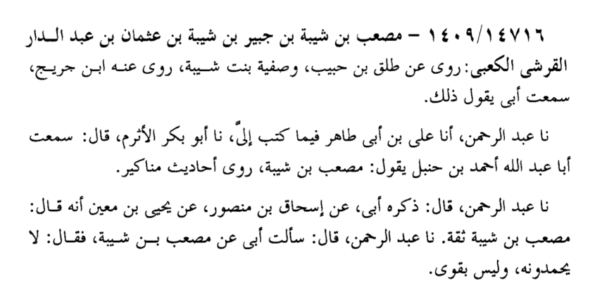 Likewise, Zakariyyāʾ’s immediate cited source, the Meccan tradent Muṣʿab b. Šaybah (fl. early 8th C. CE?), had a mixed reputation: al-ʿIjlī and Ibn Maʿīn said that he was “reliable” (ṯiqah);
