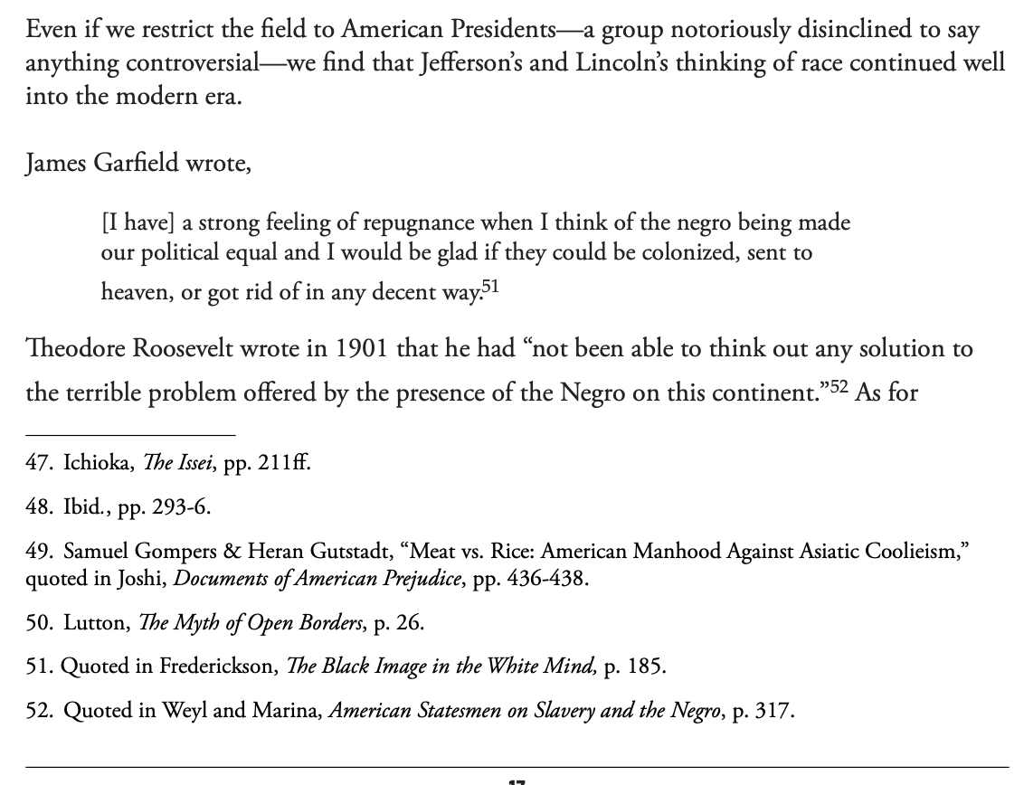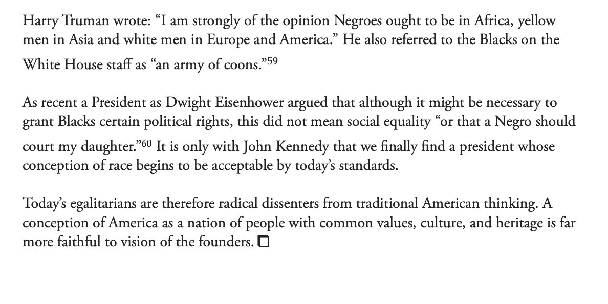 Today this is sometimes acknowledged when convenient for the narrative, but a white person who expresses the views of the founders is un-american. Schroedingers America. The past is evil and racist, but simultaneously you betray our principles if you want to keep America white.