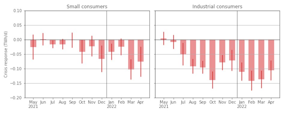 We find a significant reduction. Industry cut more than households, and timing is different: households saved gas after Russia’s invasion, while industry started as early as Aug ‘21, when wholesale prices started surging. In April, residential demand was down 6%, industry 11%.(2)