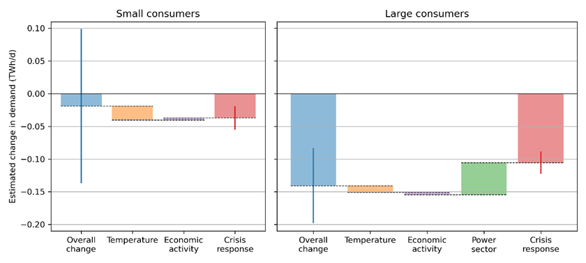 Here is the average response since August. Look at the confidence intervals: if you don’t control for covariates such as temperature, you don’t find any statistically significant effect for small consumers. If you do, you do. (3/6)