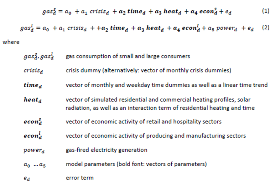 How did we get there? We first split gas consumers into two parts, small and large. Then we fed daily data on temperature, economic activity, power demand, seasonality and time trend into a multiple regression model to identify the change in behavior. Here is the math: (5/6)