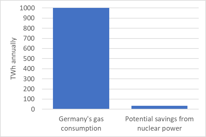 If you keep them online, they sometimes replace gas-fired power plants. Let's be very optimistic: If that's the case in 50% of all hours of the year and we assume 100% nuclear plant availability, 30-40 TWh of gas is saved per year. (3/7)