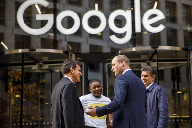 "Matt Brittin (R), President, EMEA Business & Operations at Google, BRENT HOBERMAN (L), Chair of Taskforce greet Prince William (2ndR) during his visit to Google & YouTube to launch a National Action Plan to tackle cyberbullying ,Nov. 16, 2017 in London"