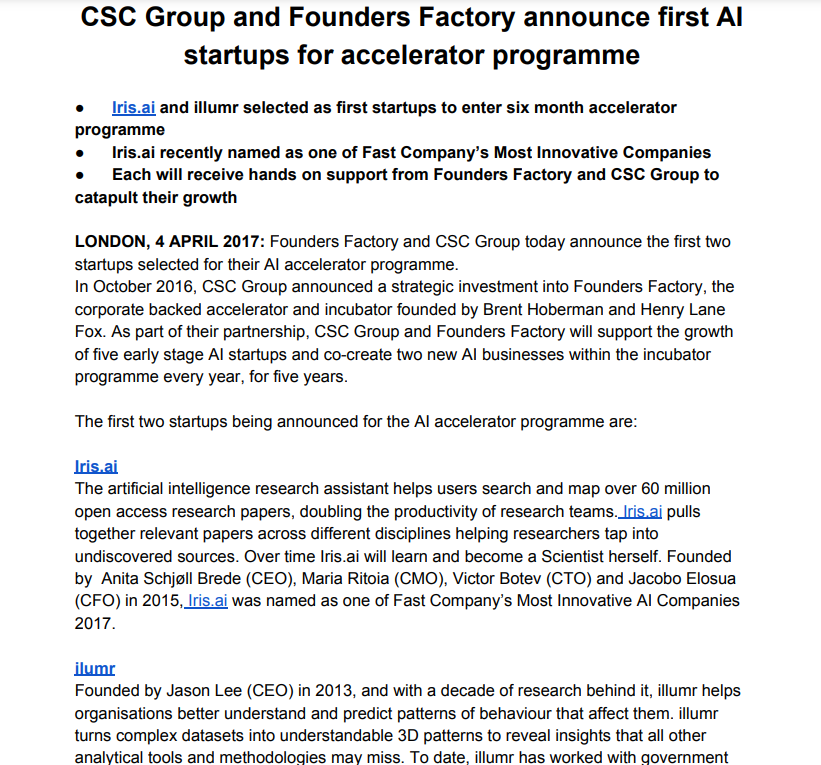 "Now, the firm is turning its attention to the UK. CSC has agreed to a five-year deal with Founders Factory to invest in and scale five AI startups and co-create two new companies every year."