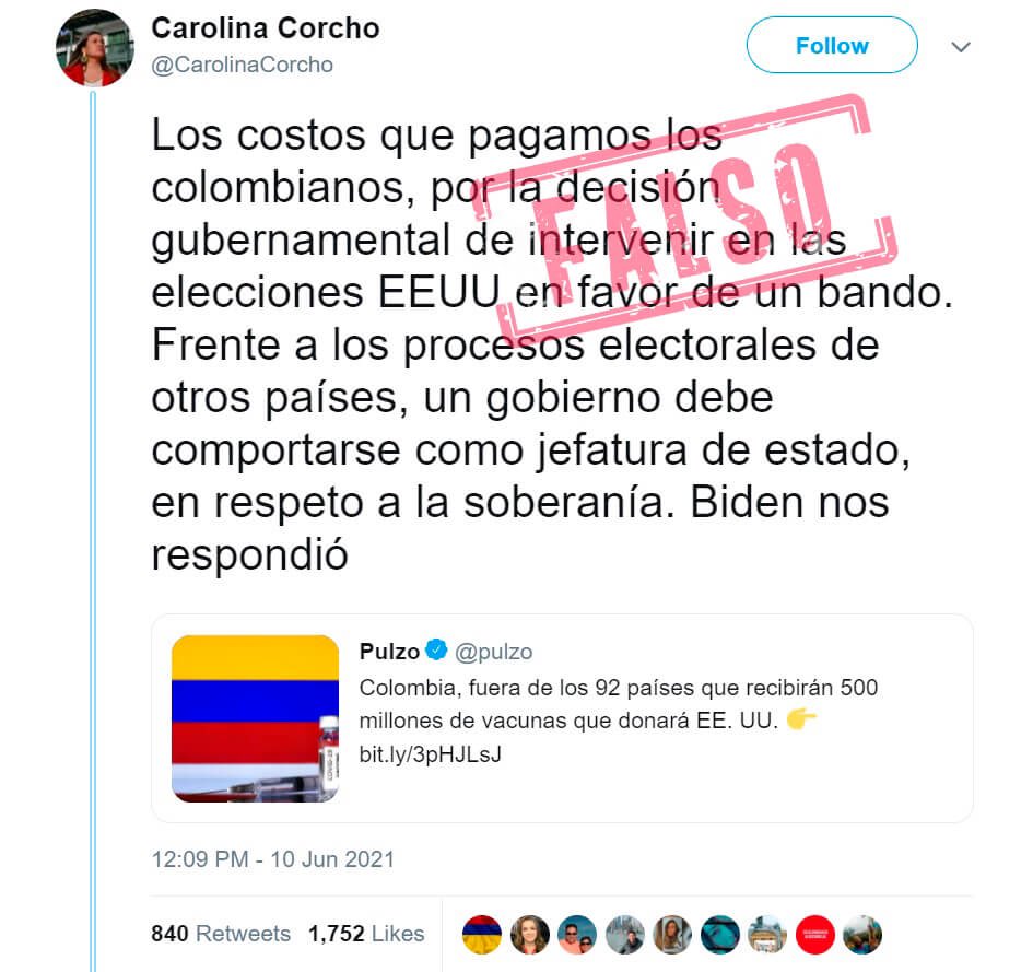 1. El 10 de junio de 2021 la médica se inventó que EEUU nos había excluido del suministro de vacunas por un tema de carácter electoral.