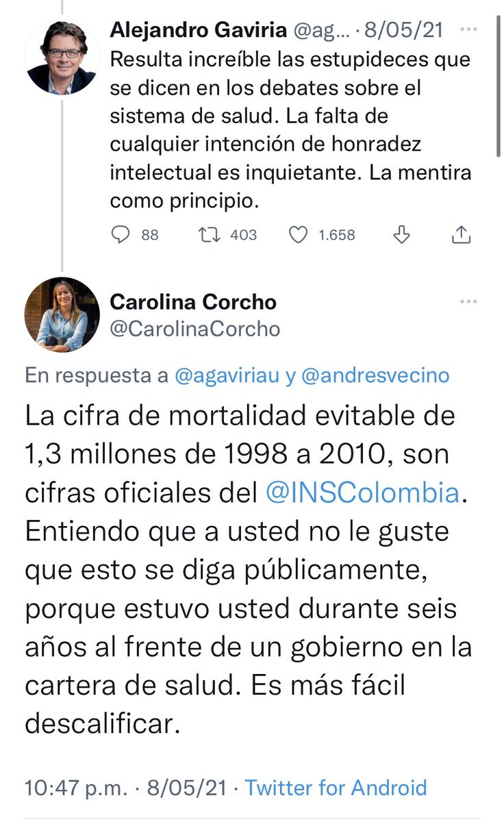 2. En mayo de 2021 en varias entrevistas dijo que en “Colombia han fallecido por mortalidad evitable un millón trescientas mil colombianos entre 1998 y 2010” lo cual es falso e impreciso y a lo cual el mismo Alejandro Gaviria le respondió en su momento.