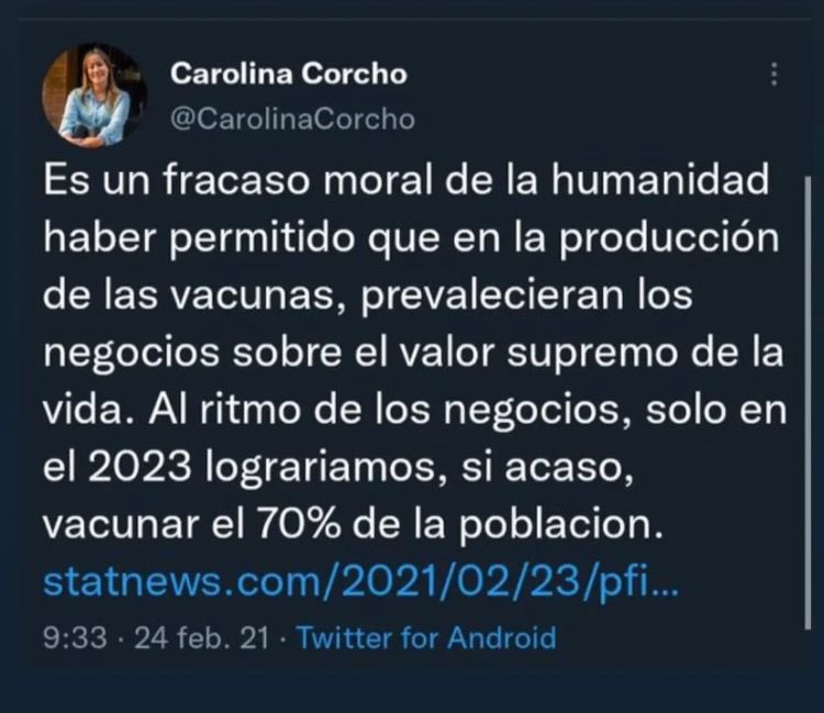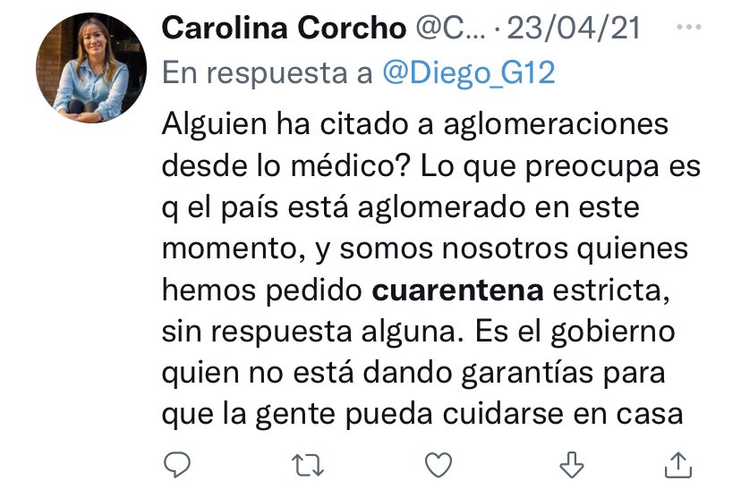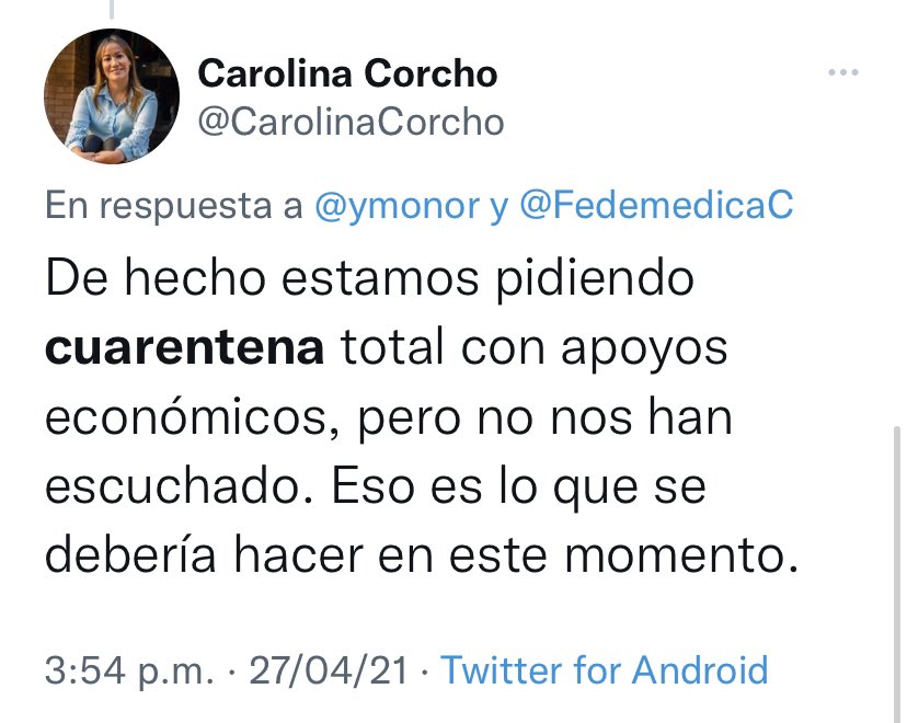 8. En abril de 2021 luego de un año de inicio de la cuarentena en Colombia Carolina Corcho seguía insistiendo en cuarentena total para todo el país. 😳😨😨