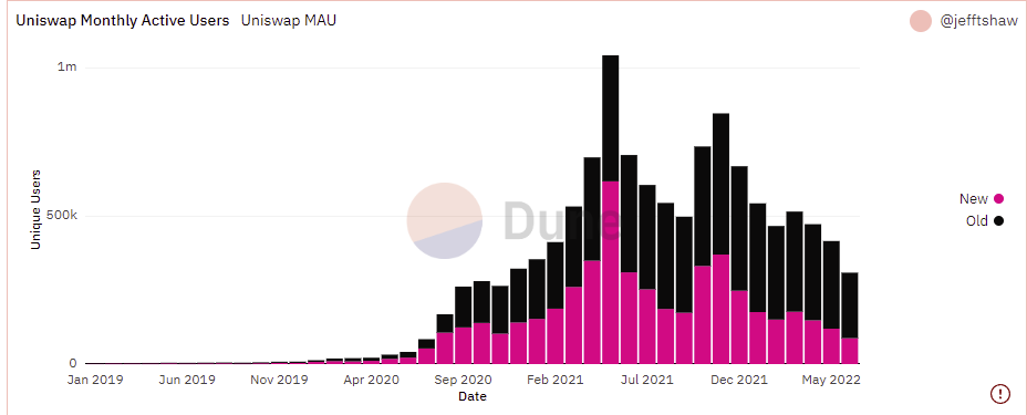 Lets look at Uniswap monthly active users from @DuneAnalytics . During the May 2021 and November 2021 peaks, "New" MAUs peaked at 617k and 370k respectively. New users are down to just 87k or total MAUs at 308k in June vs. 1mm at the peak (-70%)
