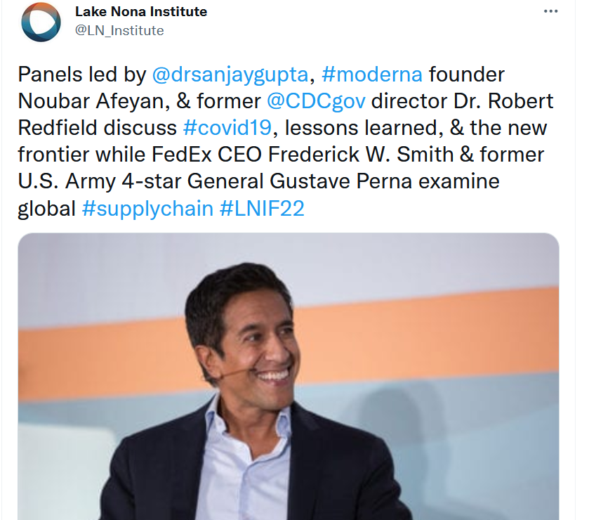 "Panels led bySanjay Gupta, Moderna's Noubar Afeyan, & former CDC director Dr. Robert Redfield discuss #covid19, lessons learned, & the new frontier; FedEx CEO Frederick W. Smith & former U.S. Army 4-star General Gustave Perna examine global #supplychain" Lake Nona Institute