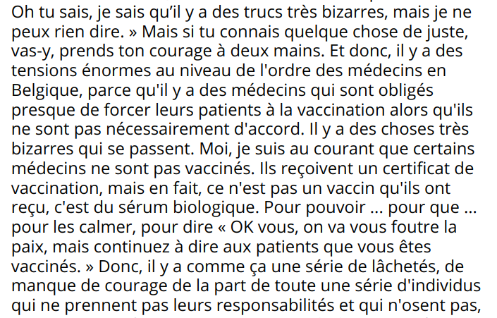 ON leur refile un certificat de vaccination sans qu'ils soient obligés de se faire injecter ce vaccin bizarre et, en échange, eux ils font croire à leurs patients qu'ils sont vaccinés et ils les poussent à se faire vacciner.