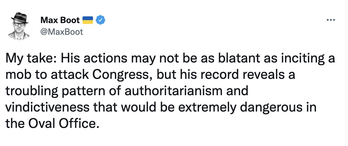 Translation: the false accusations of "racist" and "white supremacist" have lost their rhetorical power, so we are switching to "authoritarian" and "threat to democracy."