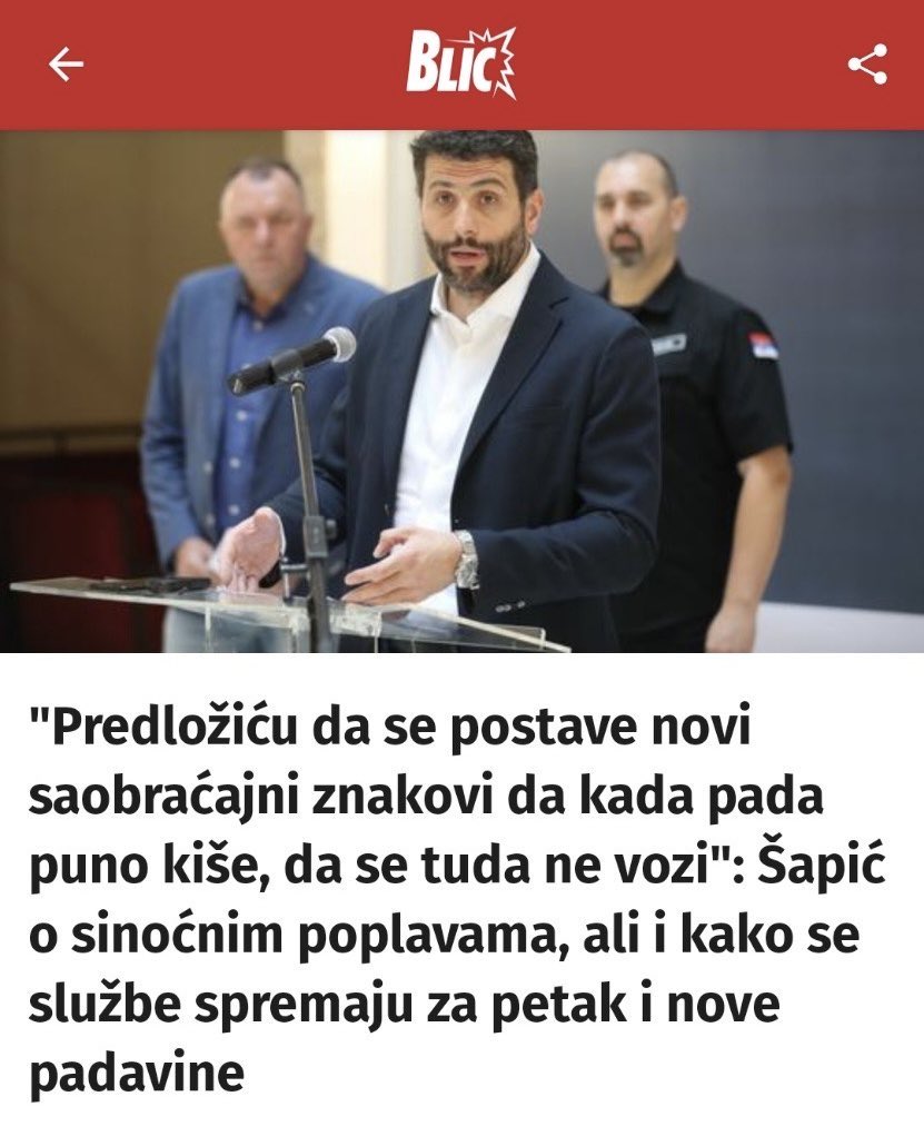 dakle glavnim gradom republike srbije vlada dream team genijalaca kojem je resenje za poplave - saobracajni znak koji ukazuje da su poplave. jer narod je u vodi do guše zavrsio samo jer nije bilo znaka. da je bio tamo znak narod ne bi iso u vodu do guše nego bi reko OH i skrenuo!