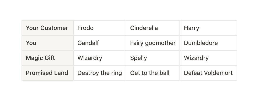 1) Name a big, relevant change in the world 2) Show that there will be winners and losers 3) Tease the promised land 4) Position your features as "magic gifts" 5) Show that you can make it come true
