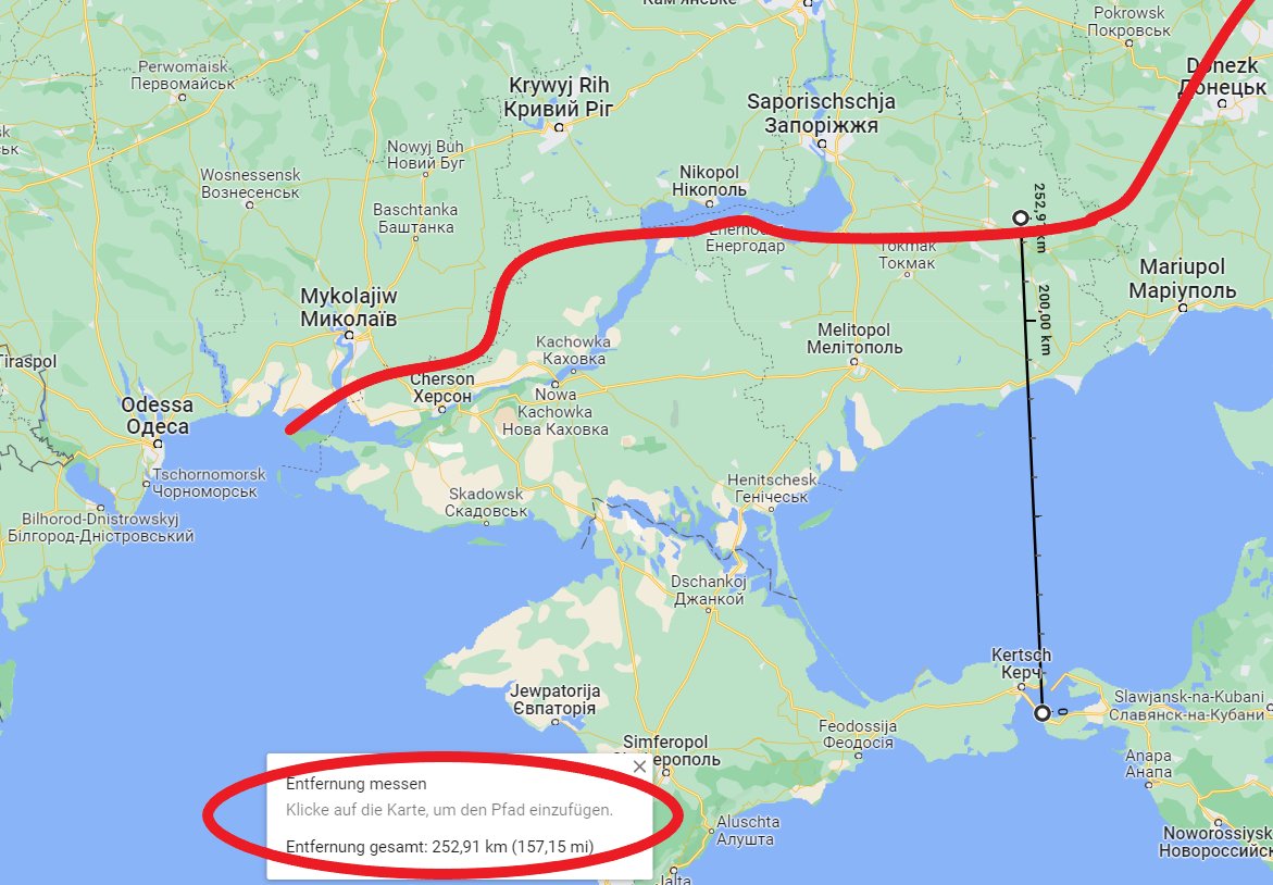 Derzeit beträgt der kürzeste Abstand zwischen ukr.kontrolliertem Territorium und der Brücke ca. 250 km.
