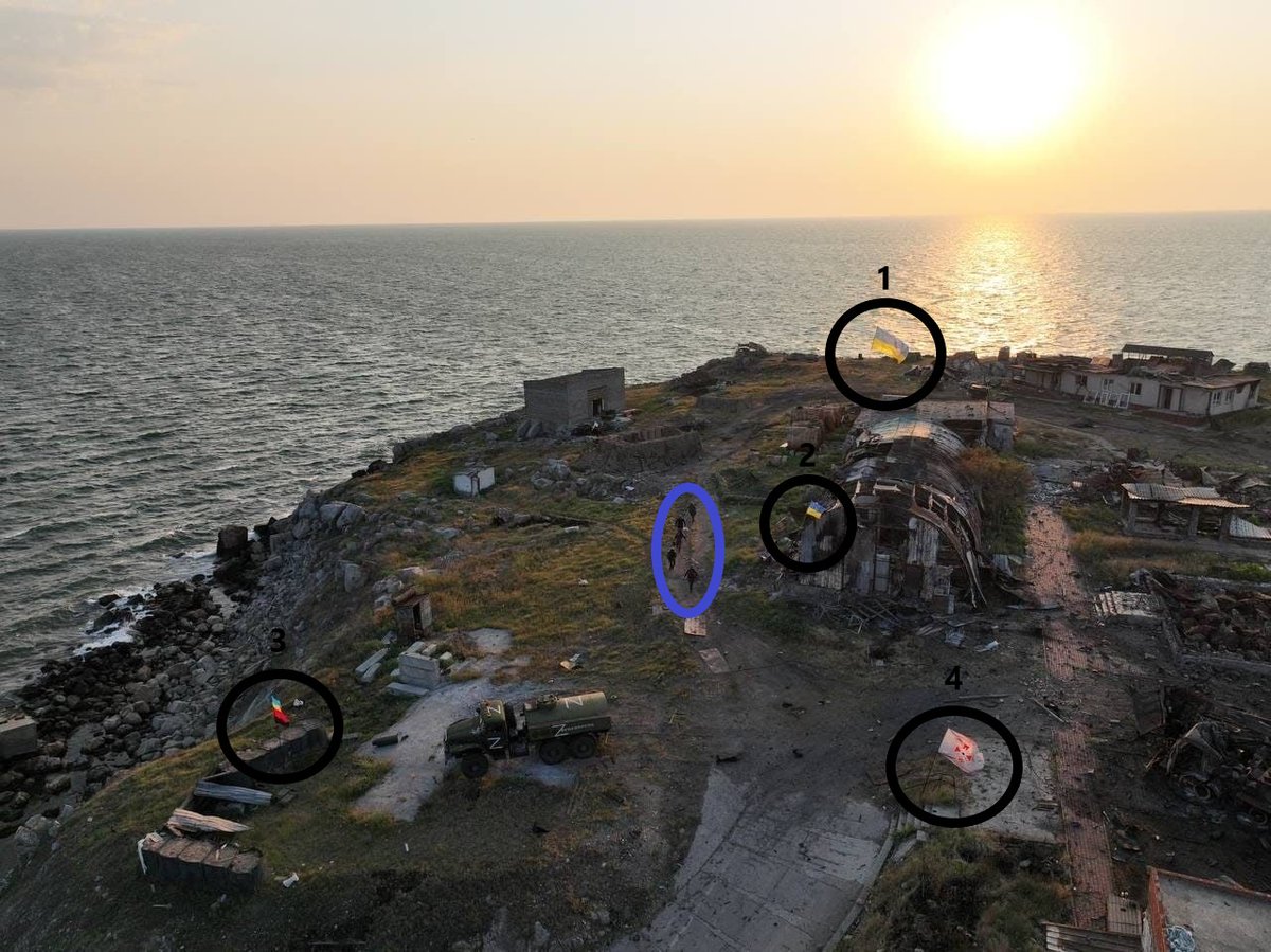 Nur wenige Stunden, nachdem die Aufnahmen verbreitet wurden, erklärte die rus. Armee, dass man den "symbolischen Flaggen-Transport" beobachtet und den Einsatztrupp auf der Insel bombardiert habe.