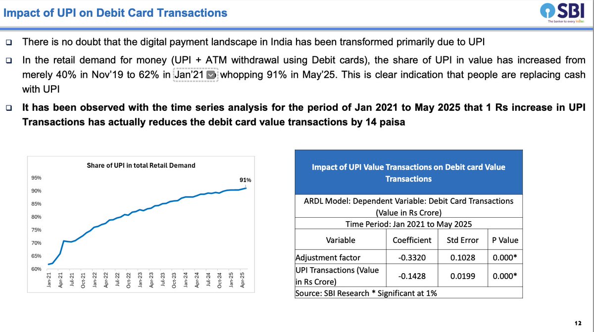 โธ Debit cards account for 10% of transactions but 18% in value โ the volume and volume has shrunk from previous years and is likely because of the rise of UPI.