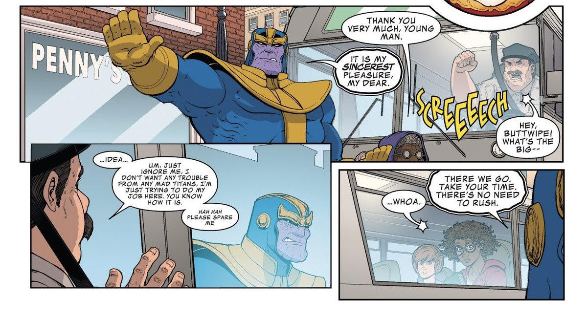 Cela a conduit le Titan fou au coin d'une rue de Manhattan, où Thanos a retardé un chauffeur de bus d'un regard furieux et, a aidé une femme âgée à traverser la rue.