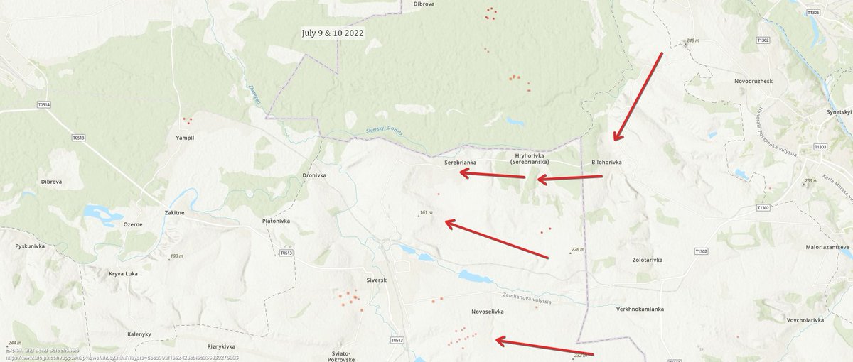 July 7th (here we see the lake Geolocated and the forest being hit in red). By then the #Russians had long captured the town as well as neighboring Bilohorivka and the large oil refinery south of the junction. Still as they tried to advance west this small forest patch remained