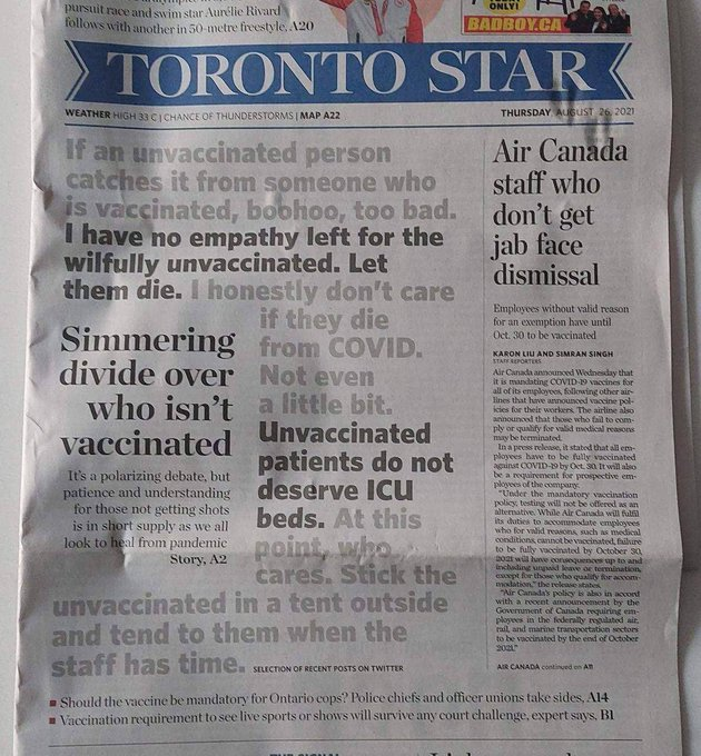 25/ "Je suis pour rendre la vie invivable aux non-vaccinés, leur pourrir la vie. On a une arme à notre disposition et il y une minorité de connards qui ne veulent pas se faire vacciner".