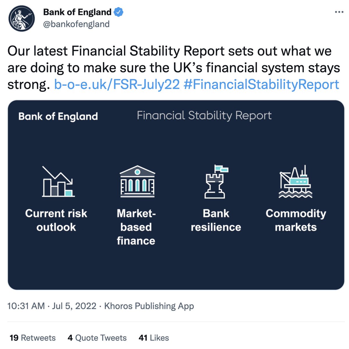The Bank of England published its Financial Stability Report this morning. It's codswallop. This is a short thread to point out the failings in its own tweets about it and to suggest what they really mean.....