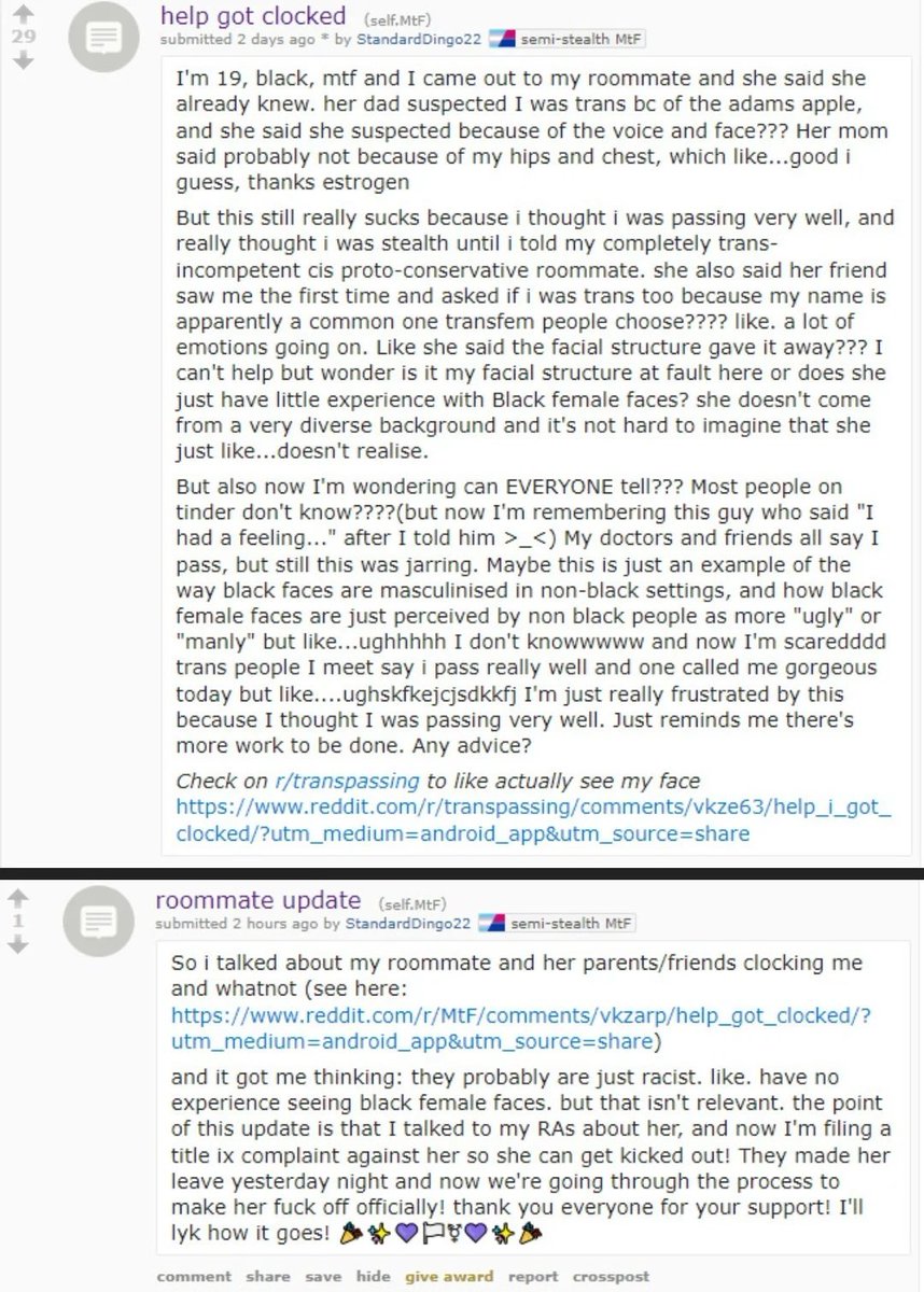 "I came out to my roommate and she said she already knew, she said she suspected because of the voice and face???