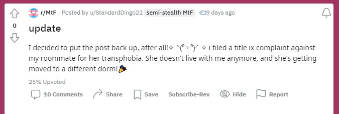 I talked to my RAs about her, and now I'm filing a title ix complaint against her so she can get kicked out! They made her leave yesterday night"
