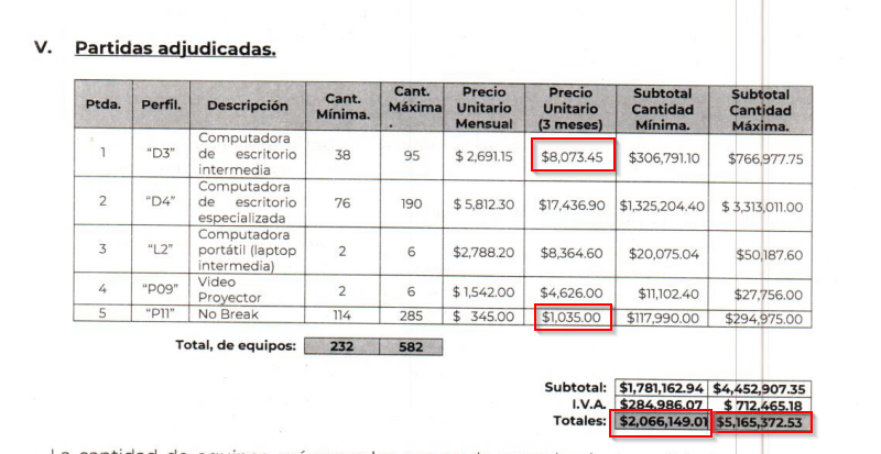 El problema es que de estas compras, podemos ver cosas muy sospechosas como que una computadora "intermedia", costaría a la renta por 3 meses 8073 pesos. Es decir que pagaríamos por una computadora de este tipo, 32,292.