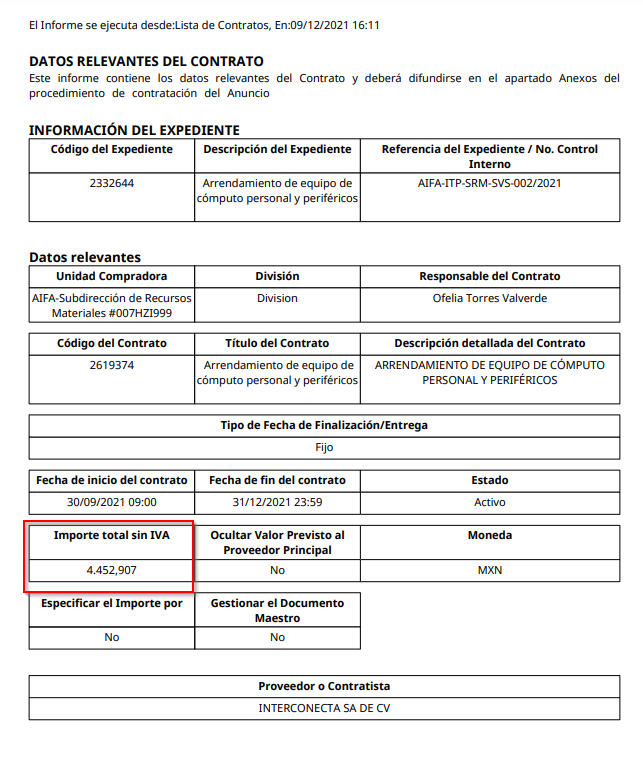 Resulta que el Aeropuerto Felipe Ángeles adjudicó a la empresa Interconecta un contrato por 4,452 mil pesos más IVA (5 millones, 165 mil pesos) por rentarles equipo de computo de Septiembre a Diciembre de 2022. Según se pude consultar en COMPRANET.