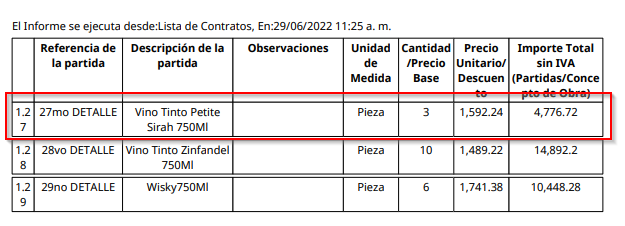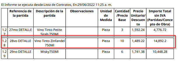 Vino tinto Petite Sirah, que en tiendas cuesta 159 pesos, pues el Fonatur Tren Maya lo paga en 1592.24 pesos.
