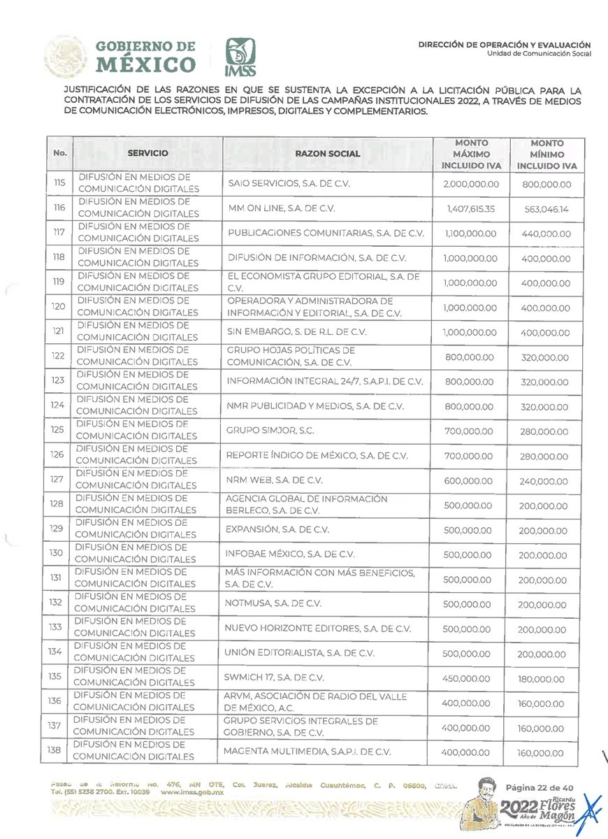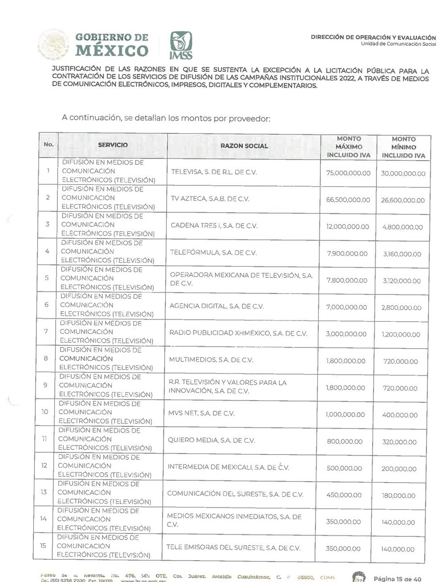 De acuerdo al contrato 2456949 adjudicado el pasado 15 de Junio, el IMSS pagó por la difusión de campañas institucionales.
