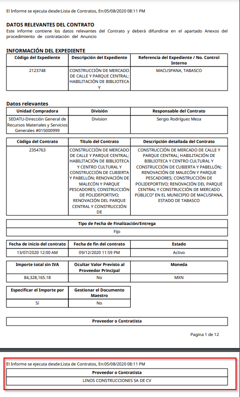 Resulta que en 2020, la SEDATU de Román Meyer adjudicó el contrato a Linos Construcciones, empresa de la CDMX para la construcción del Malecón, Mercado y otras cosas en Tepetitán, Macuspana, tierra del presidente.