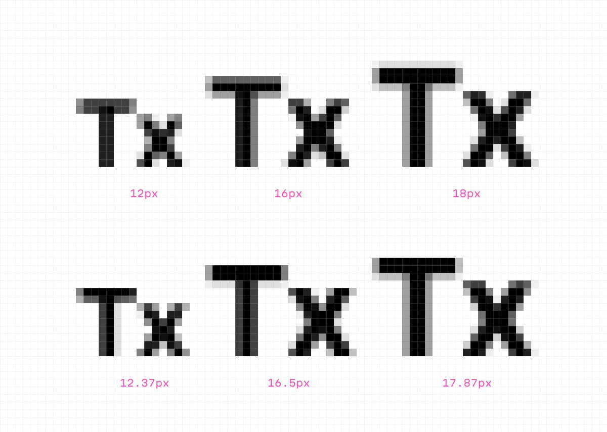 However, the problem is that, in terms of real pixels, the actual visible size of the character doesn’t match the given font size value, and in most cases, this visible size doesn’t match the pixel grid.