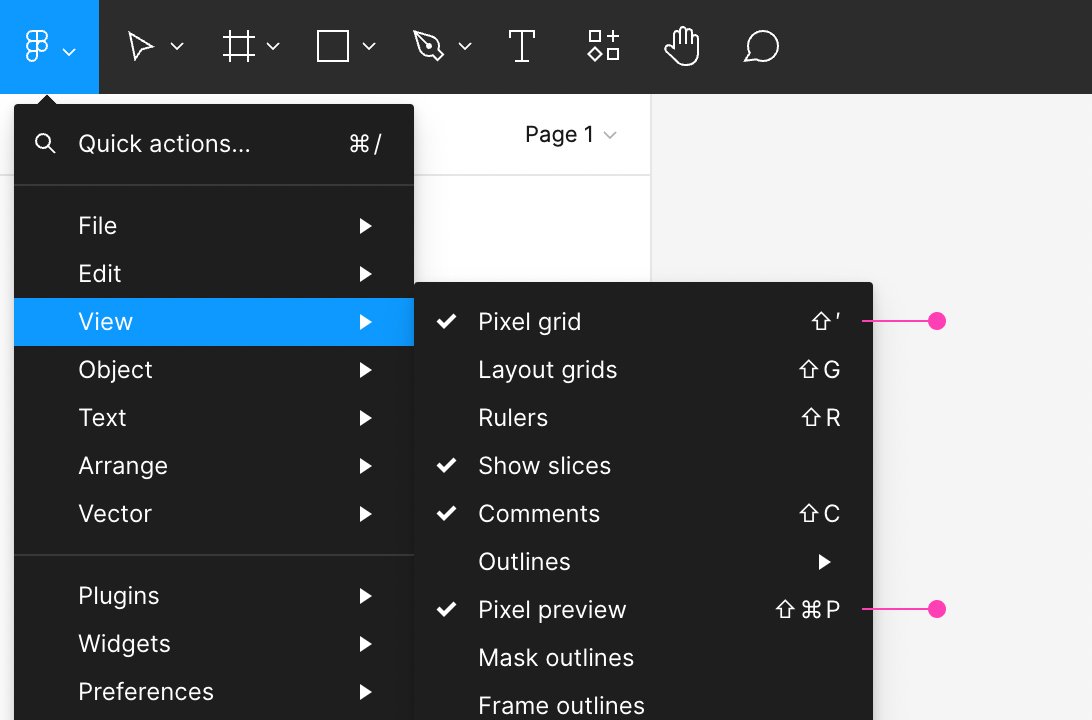 Then, turn on pixel preview. `View → Pixel Preview` in Figma, `View → Canvas → Show Pixels on Zoom` in Sketch.