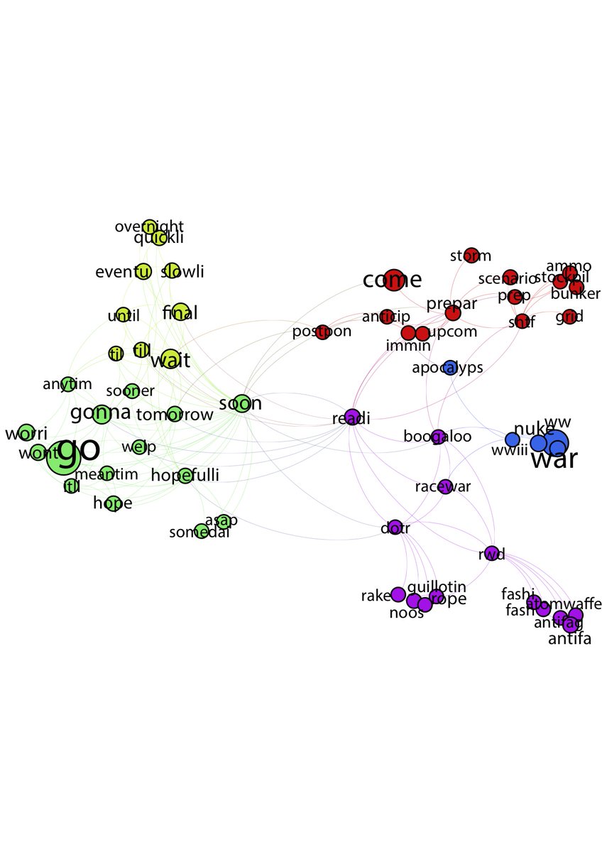 NCRI topic networks from over 100 million comments, depict the Boogaloo as an apocalyptic militia which has been incredibly prescient. 4chan and other extremist communities fantasize of a mass, violent civil war with RWDs (right wing death squads) and ANTIFA as far back as 2019.
