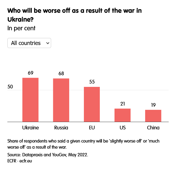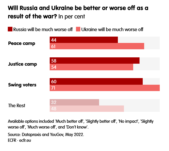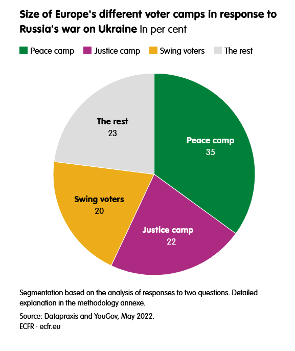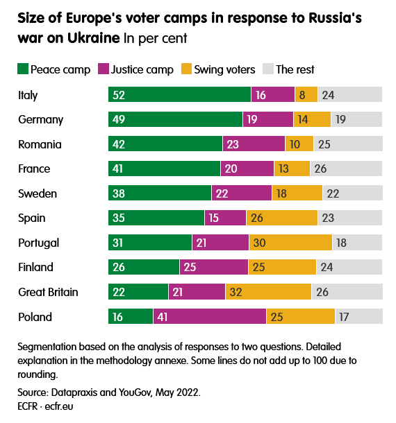 That said, the ones who want "peace" in Ukraine outnumber the justice-seekers, though by no means are they dominant, with nearly half the public undecided. In general this tendency is most pronounced in Italy, Germany, Romania, France. /4